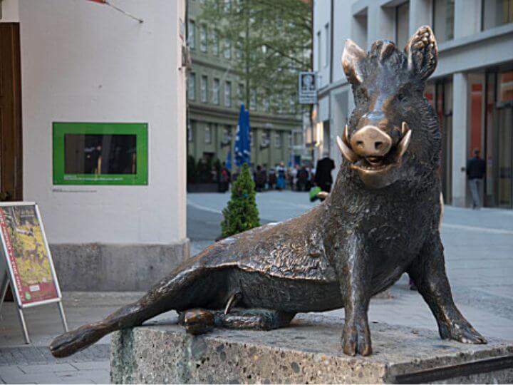 這款銅雕塑豬采用野豬的坐姿造型,后腿坐著,前腿撐地,頭部直立,展現(xiàn)出一種自然而又充滿力量的姿態(tài)。這種設(shè)計(jì)不僅生動(dòng)逼真,還具有很強(qiáng)的觀賞性.